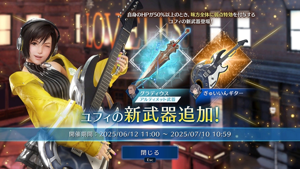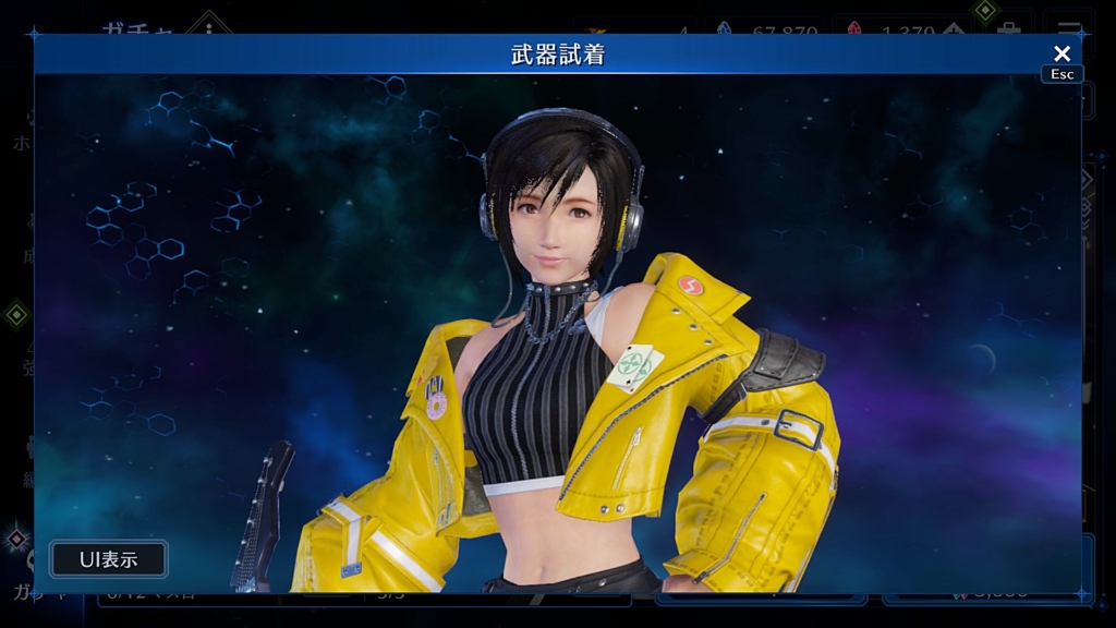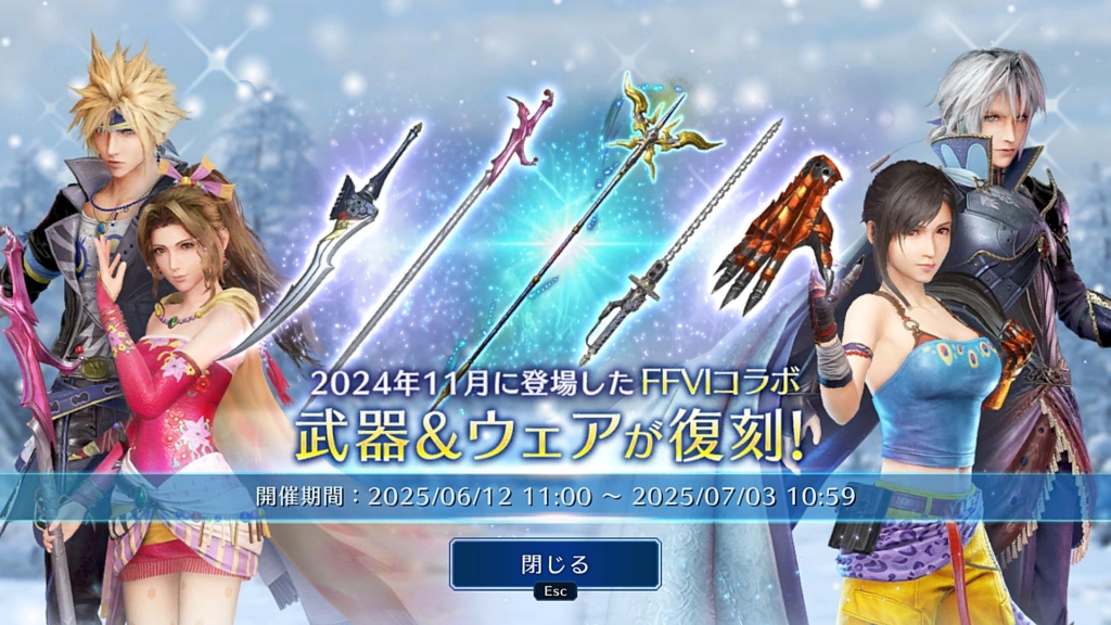 これはみんなの衣装があまり刺さらなかったから開催当時誰のガチャも回さなかったんだけど、このコラボ期間中に出るエアリスのアルティメット武器は欲しくて…