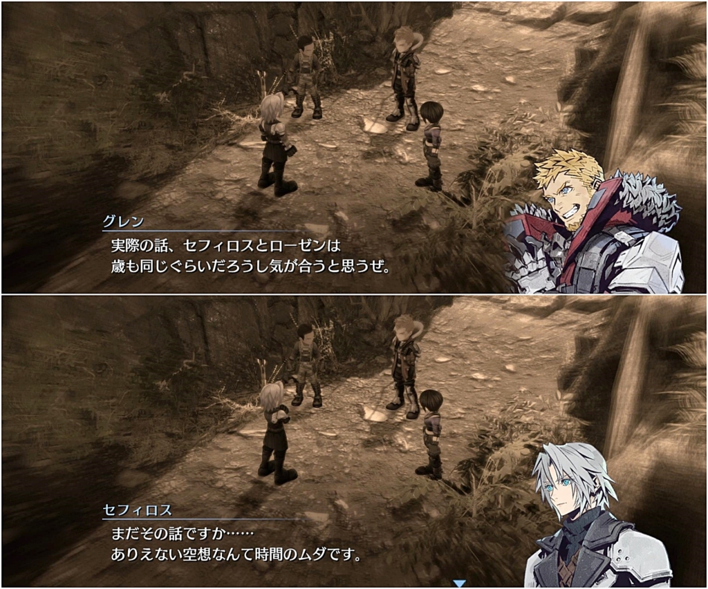 初めて自分のことを英雄としてではなく一個人として普通に接してくれたグレンたちが嬉しかったセフィロスは、そのグレンたちがローゼンのほうに向いてしまうのが怖かったとか。