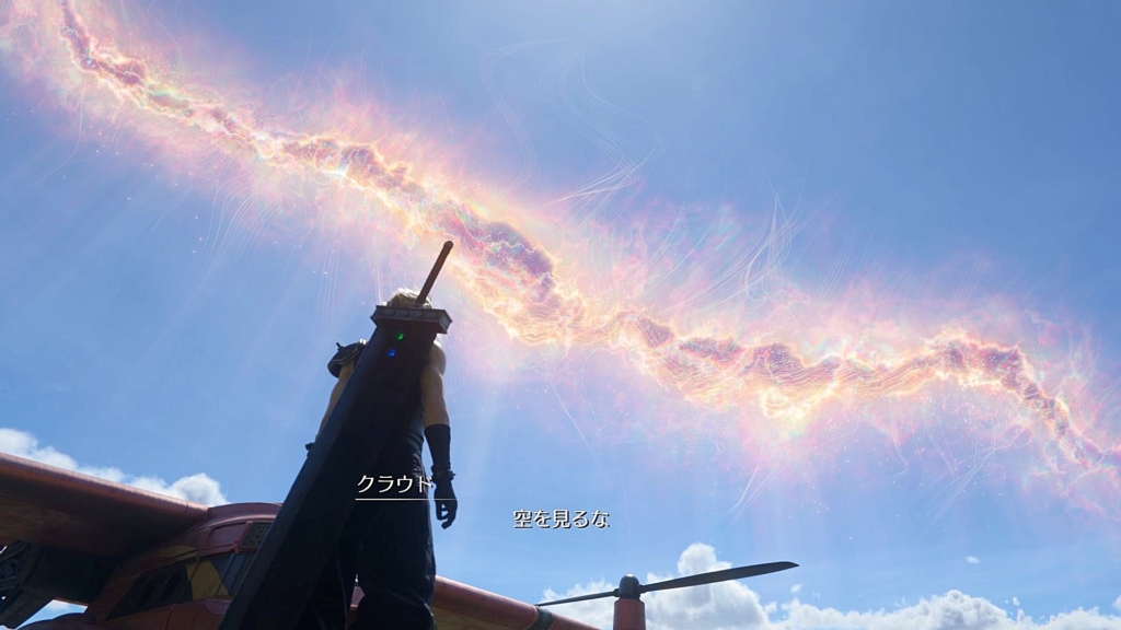 そしていつかのエアリスの言葉「空を見ないで」を思い出して、空を見るなと仲間たちに促すけど、仲間たちの見る空は当然普通の空。