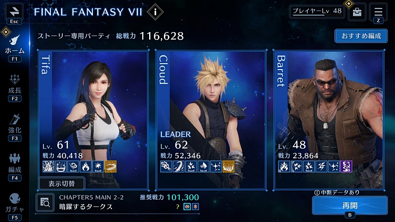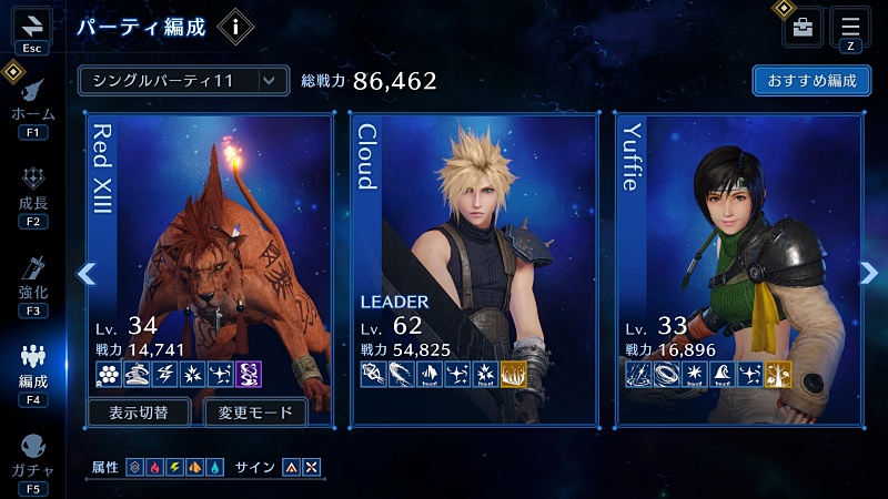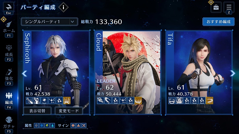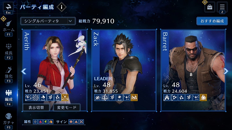 CCのストーリーやキャラストーリーでザックスやエアリス、バレットもレベル上げないとならない状況になって組んだパーティ。