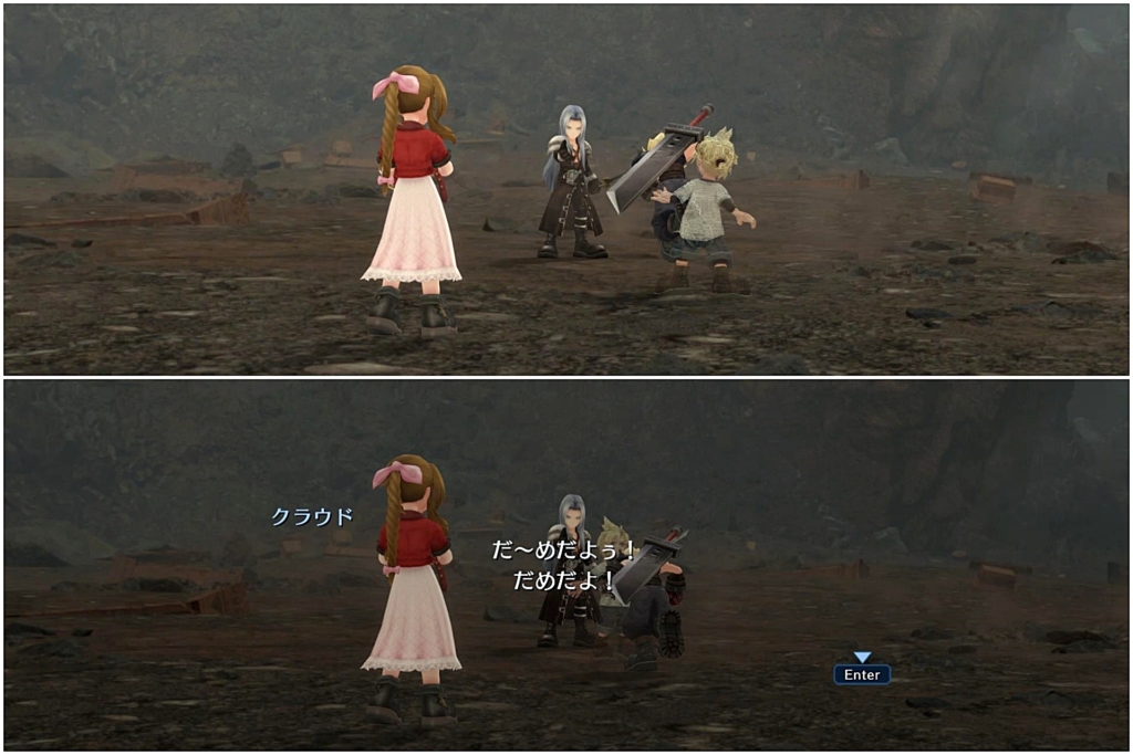 そして原作ではこうした精神状態でエアリスを殴りつけるクラウドだったけれど、エバクラ7は強めに突き飛ばすにとどめられてた。