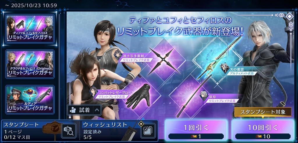 なので、いちばん欲しいユフィの衣装を取る目的で1ページだけガチャ回そうかなと思っていたんだけど、今週のガチャでも今回のアル武器は出るらしいからそっちのガチャを見てから回してもいいかなって。