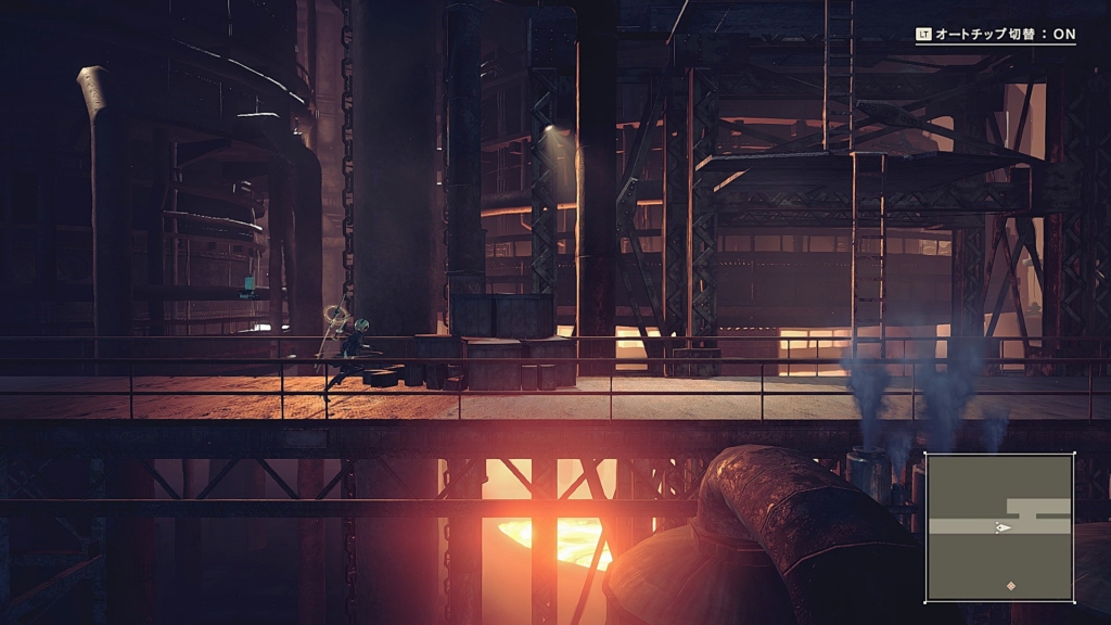 いちばん最初はよくわからないままシューティングゲームみたいなものをやらされて不安になったけど、それが終わったあと工場の廃墟地みたいな場所に。