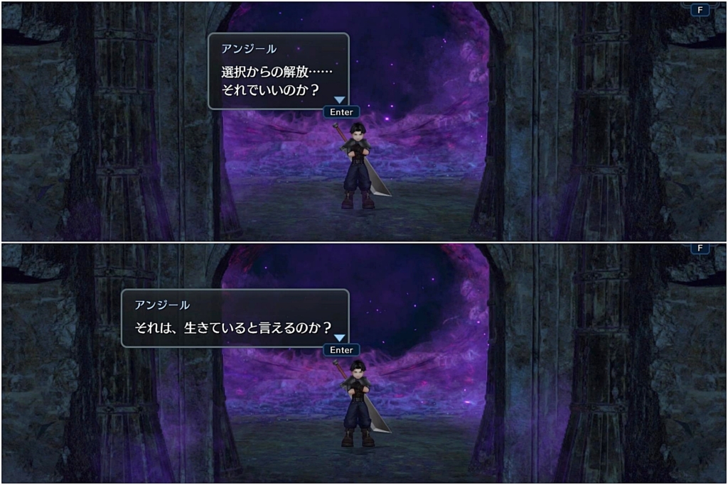 で、何度となく選択を迫られたけどここでようやく解放してやると言われ、アンジールがこう言う。