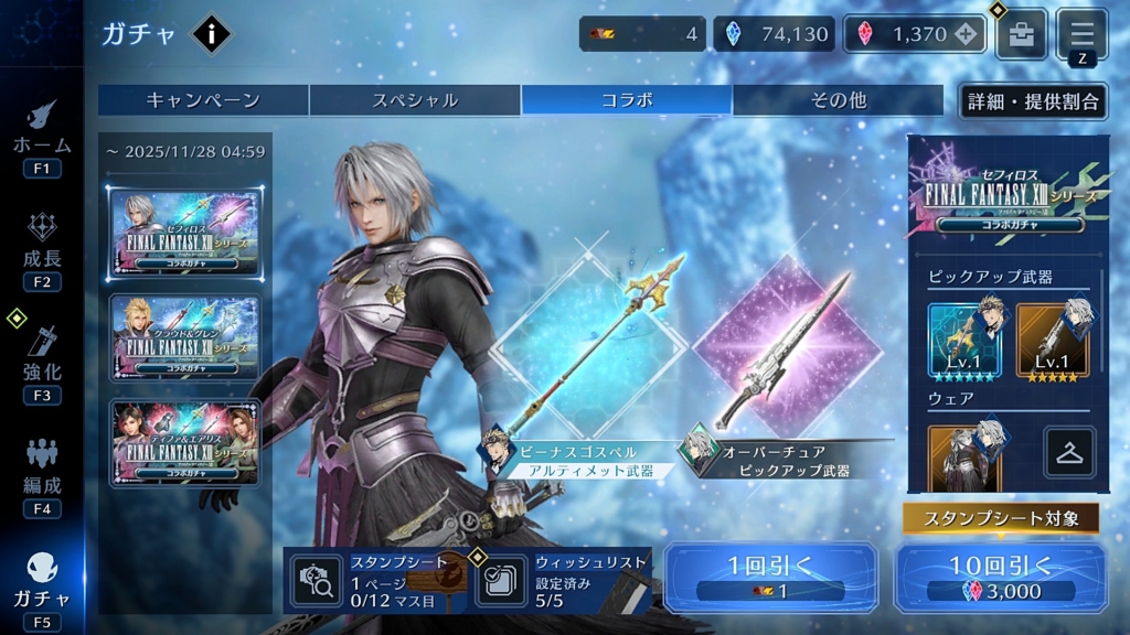この期間のアルティメット武器がシドだからガチャまわしたいんだけど。