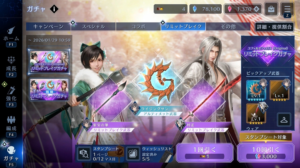 2026年新春第一弾ガチャは大人セフィロスとユフィの限定ガチャ。