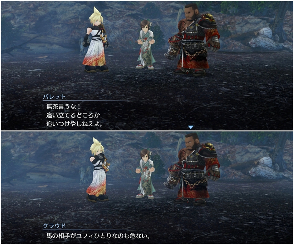 で、馬を捕まえるのを手伝ってくれというユフィに対して目をそらすクラウドとバレット。