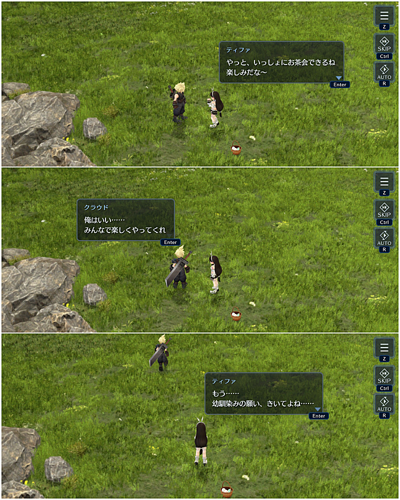 このあとにティファがそうやって誤魔化さないで!って言ってたから、クラウドがお茶会参加したくなくて適当なこと言ったの?
