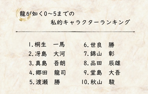 私の中で2と3位はほぼ同等なんだけど、今回真島の兄さんが少し残念だったのと冴島が更にかっこよかったから順位変えてみた。