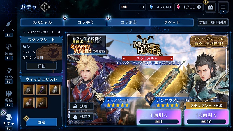 あと、このコラボ後には水着やヴィンセントやらが控えてるからブルクリを少しでも貯めておきたいというのもあって今回は3人我慢してエアリスの衣装を取りました。