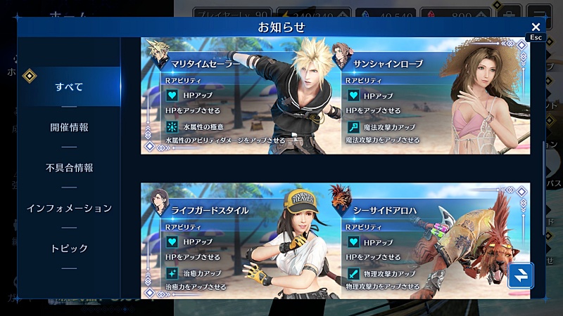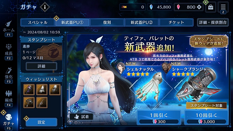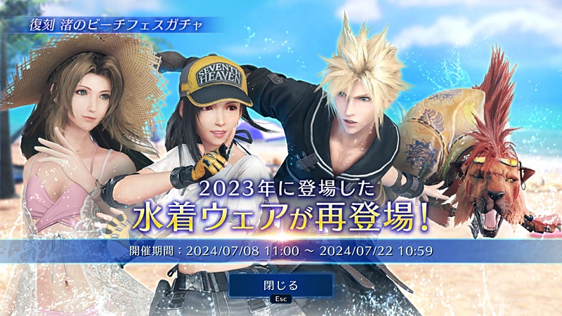 で、ブルクリ少ない消費でティファの水着取れて気分良くなったから、少し前から開催していた過去の衣装が再び引ける復刻ガチャを回そうかなと。