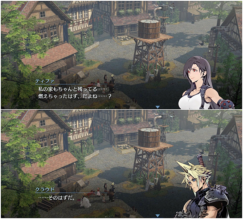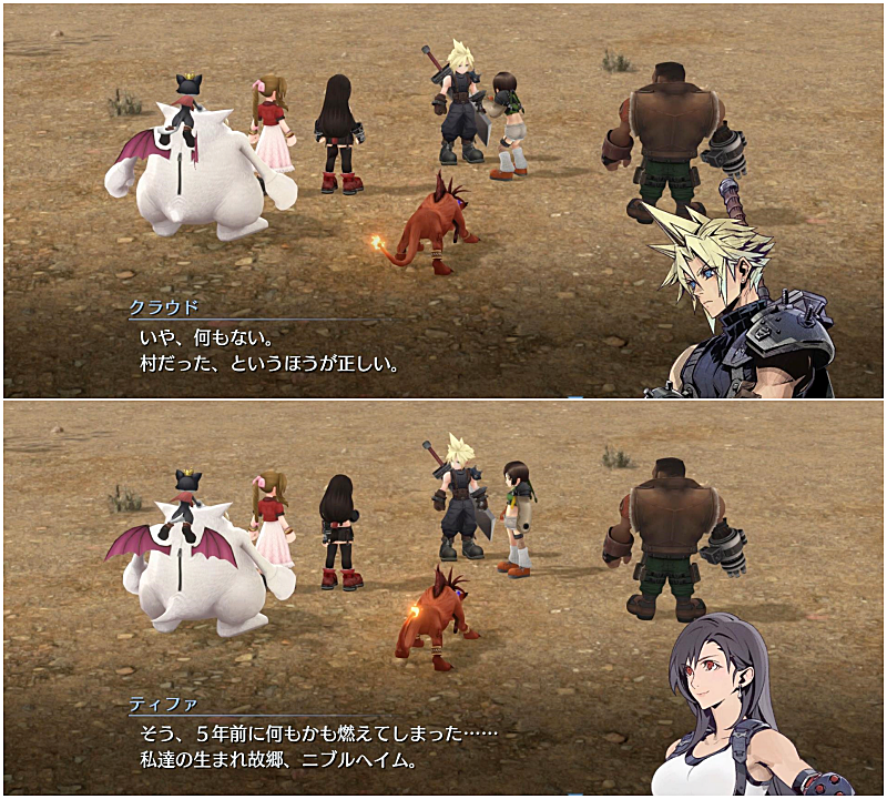 ここでの会話後、ふたたびみんなが歩き出す中、ティファはやっぱり故郷に帰るのが怖くて立ち止まる。