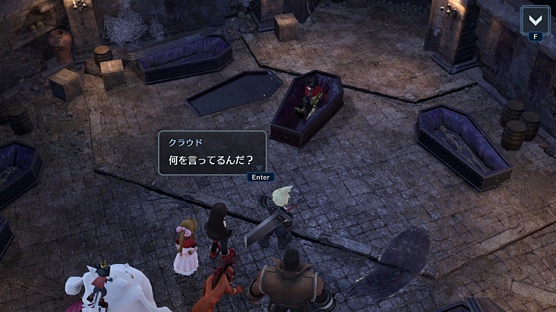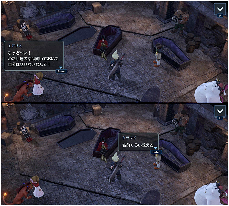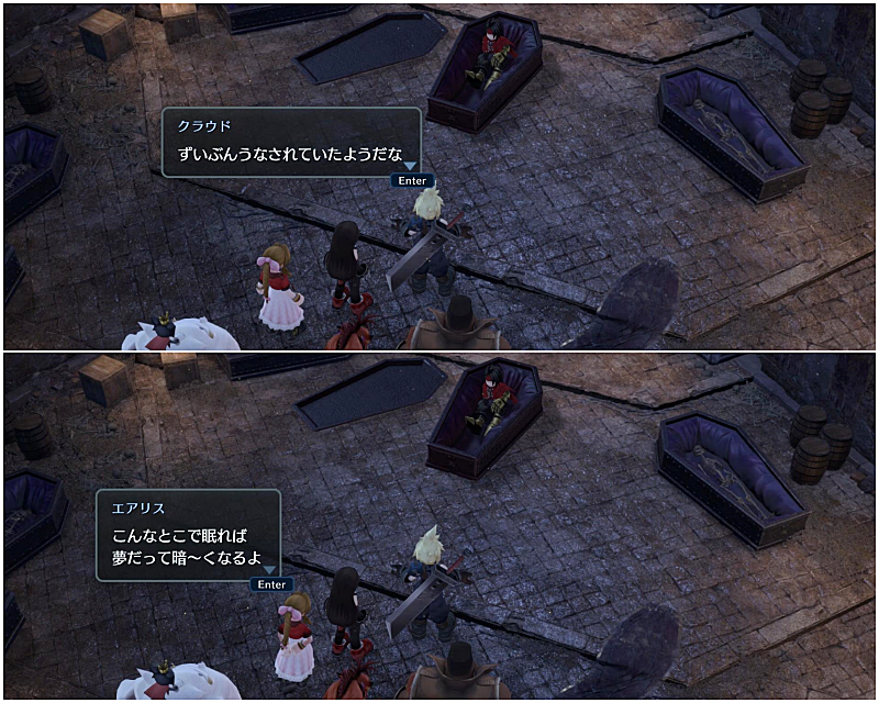 ユフィは棺桶に興味を示し、エアリスも興味ないのかナナキをかわいがってたり。