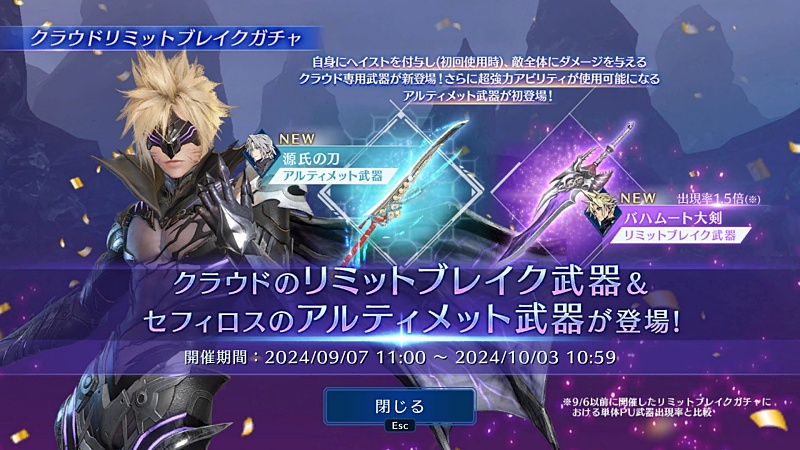 セフィロス武器は当たらなかったけどクラウドの新武器は星5が二つ出たので良しとしました。