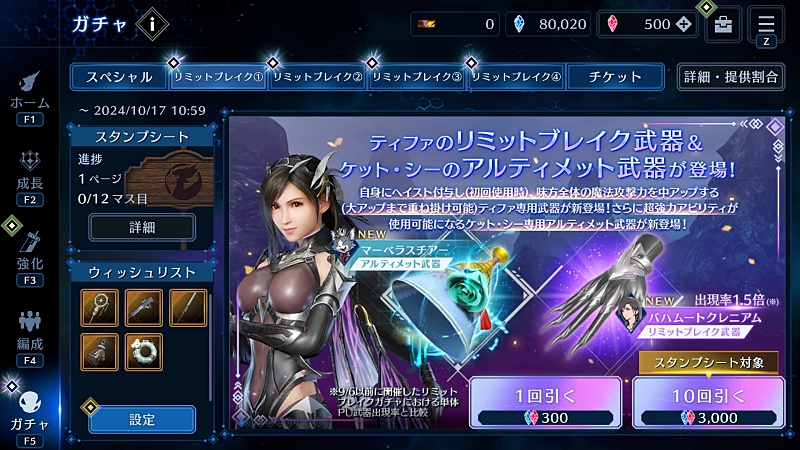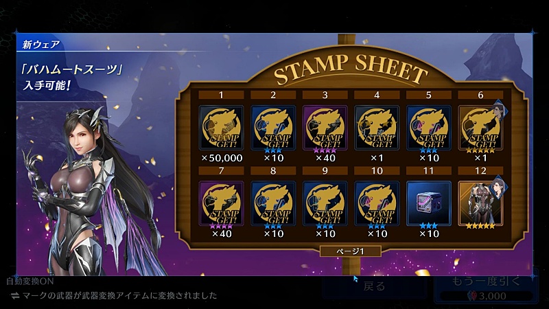 クラウド、ユフィ、エアリスまでのガチャがアルティメット武器引けるチャンスなので今一度スタンプシート見直す。