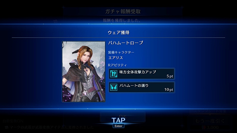 今回のバハムート衣装、私の中ではどれも微妙で限定でなかったら全員スルー確定なものだったんだけど、エアリスの衣装はユフィ同様まあまあいいかなと思えたのでセフィロス武器狙いついでにエアリスの衣装まで取ることにした。
