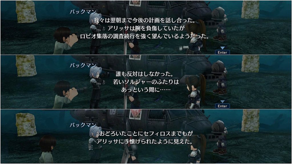 セフィロスとアンジールの目的であるロビオ調査隊の捜索はこれで完了したから本来なら帰るところだけど、アリッサがまだここでの調査が終わっていないということで調査続行を申し出る。