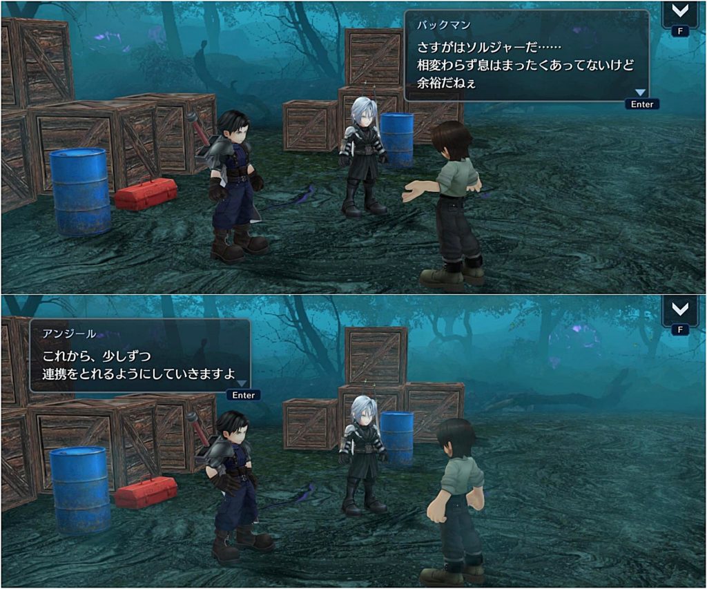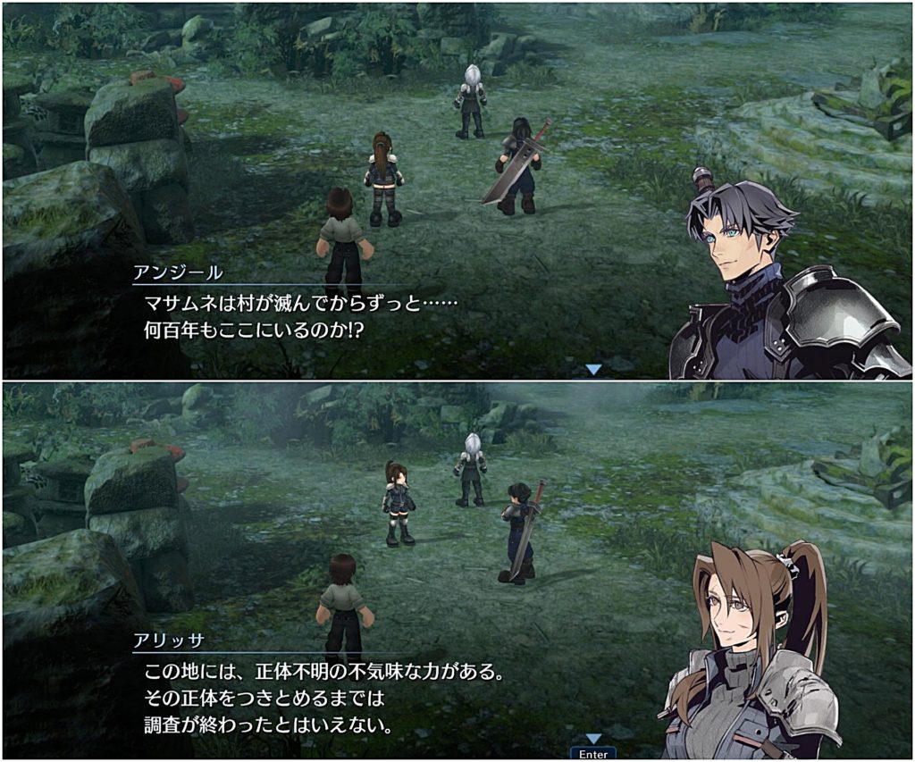 調査を進めいていく間、禁忌地帯と言われる場所だけあってこうした紫色の物体が現れたあと、昔ここであった出来事を幻影として見せられるセフィロスたち。