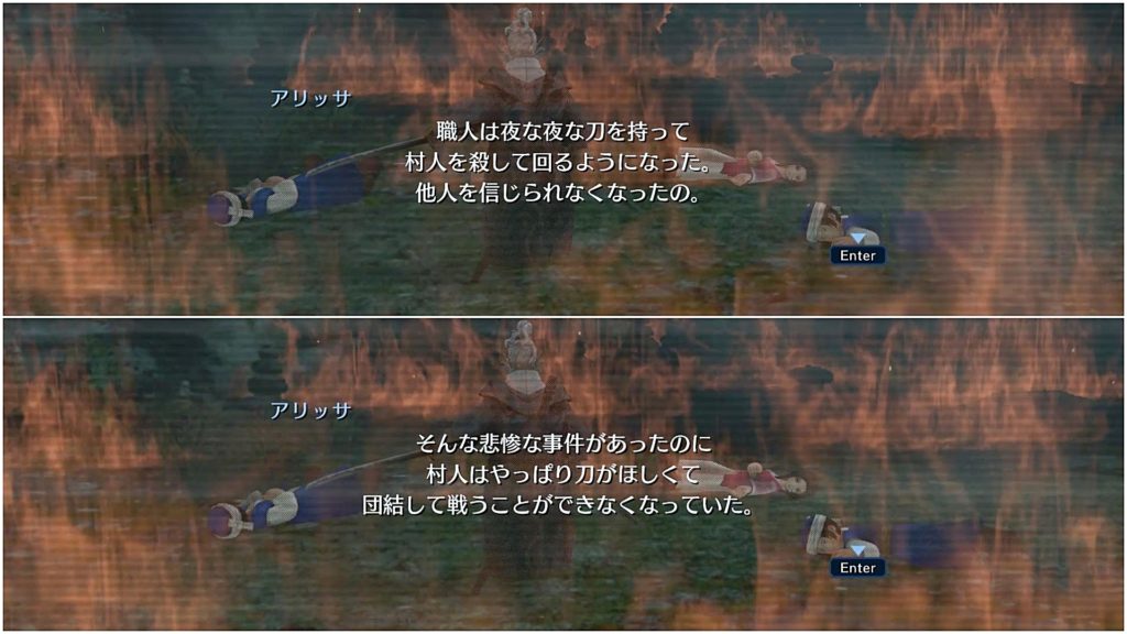 アリッサはセフィロスたちが来る前にここで調査をしていたから、昔この地で起きた出来事を知っているから説明してくれる。