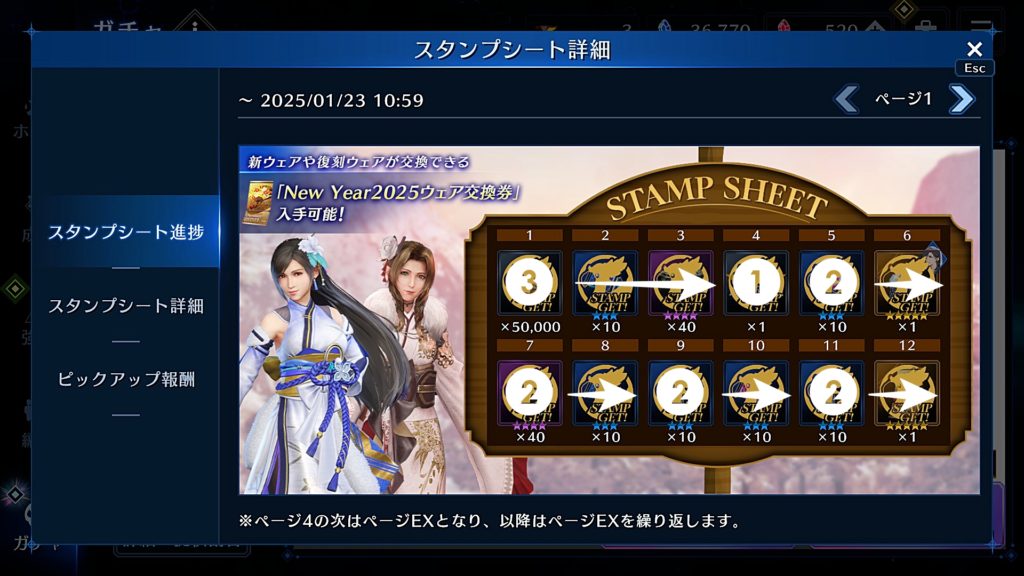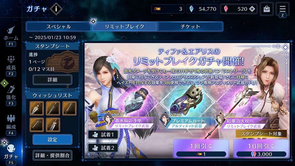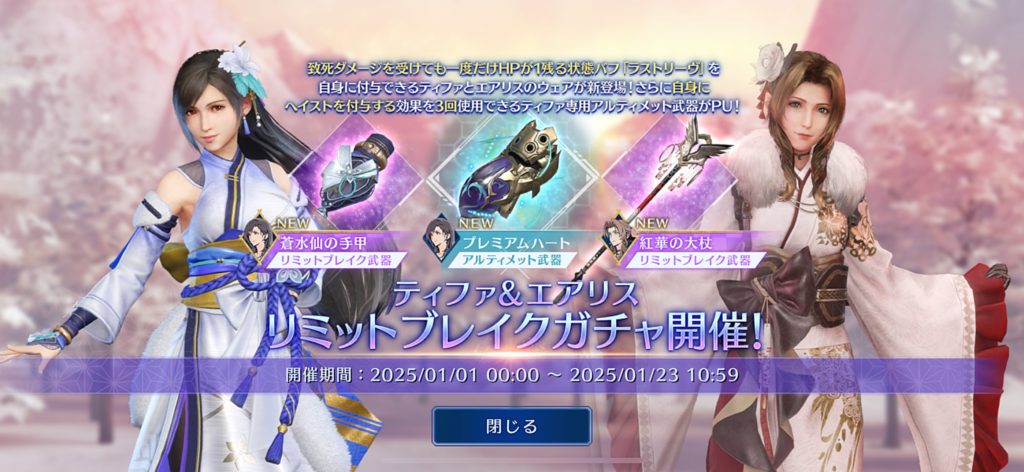 新年早々景気よくふたり分の衣装を取りに行きたいところですが、運営が最近あまり石を配ってくれないので貯石ができていないのと今月は待望のシドが登場するということでティファの分だけガチャまわすことにします。