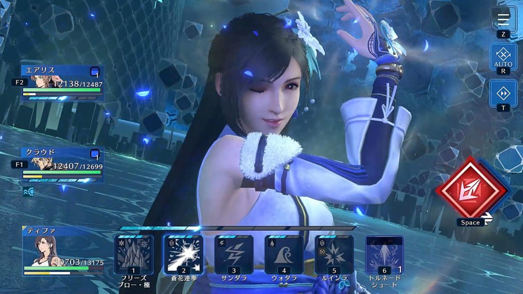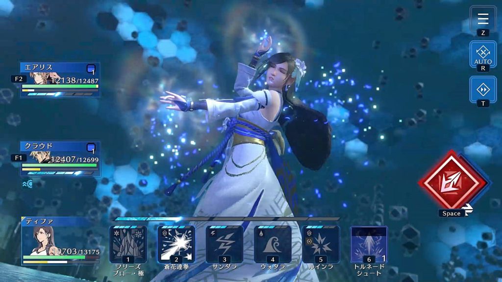 武器アビリティ攻撃「蒼花連拳」が舞うようにくるっとしたあとウィンク。