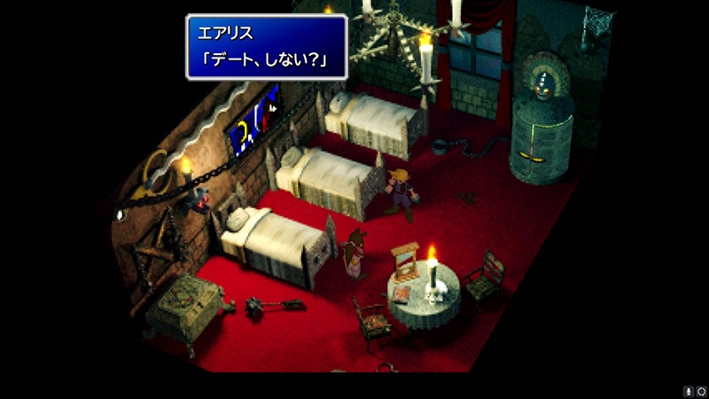 カップル的に好きなのはクラウドとティファなんだけど、7全体のストーリーで見るならここはやっぱりエアリスとデートするほうがしっくりくるかなと個人的にはそう思ってる。