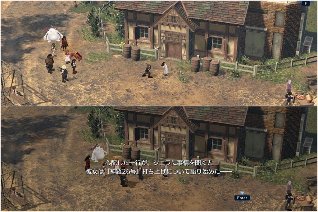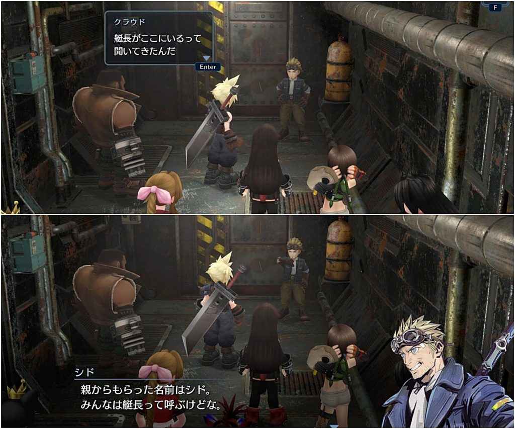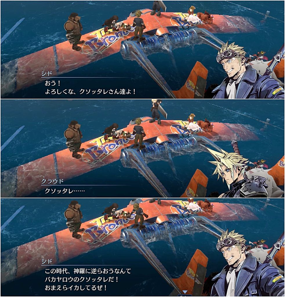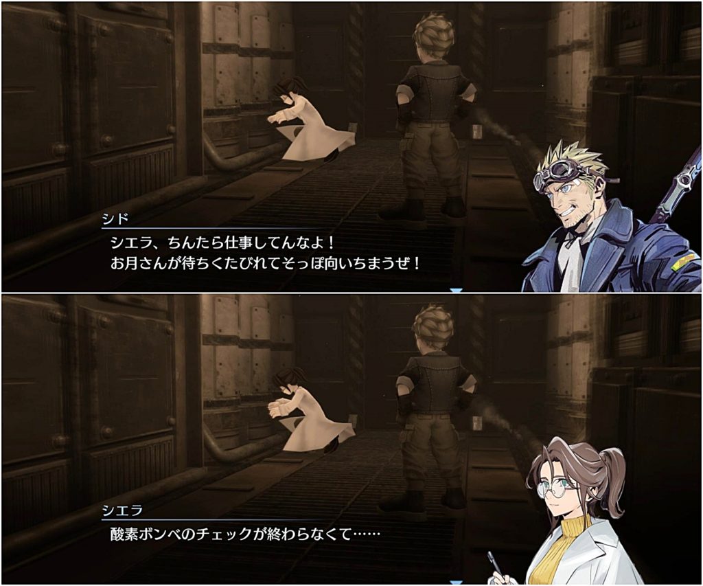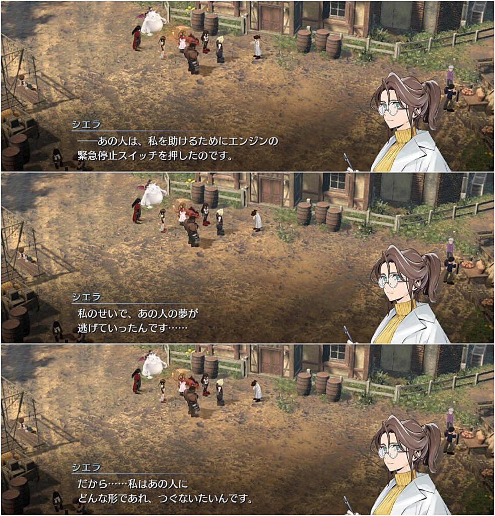 で、外に出てみるとシドがシエラに怒鳴りつけている場面に遭遇し、クラウドたちが心配してシエラに話を聞く。