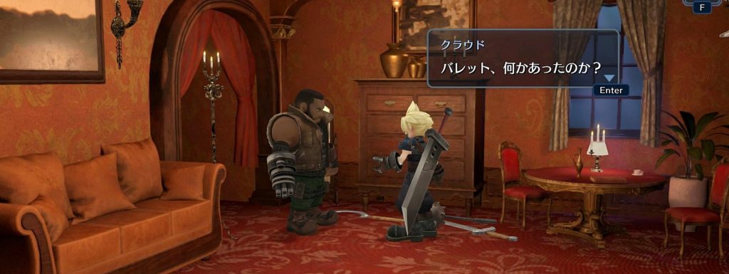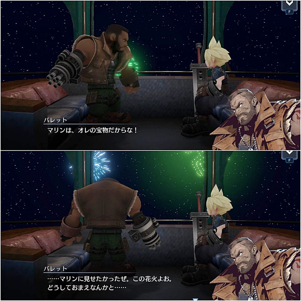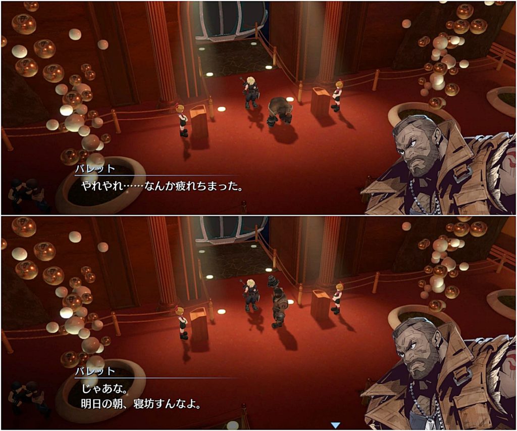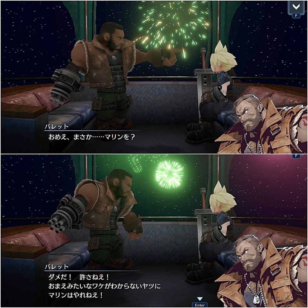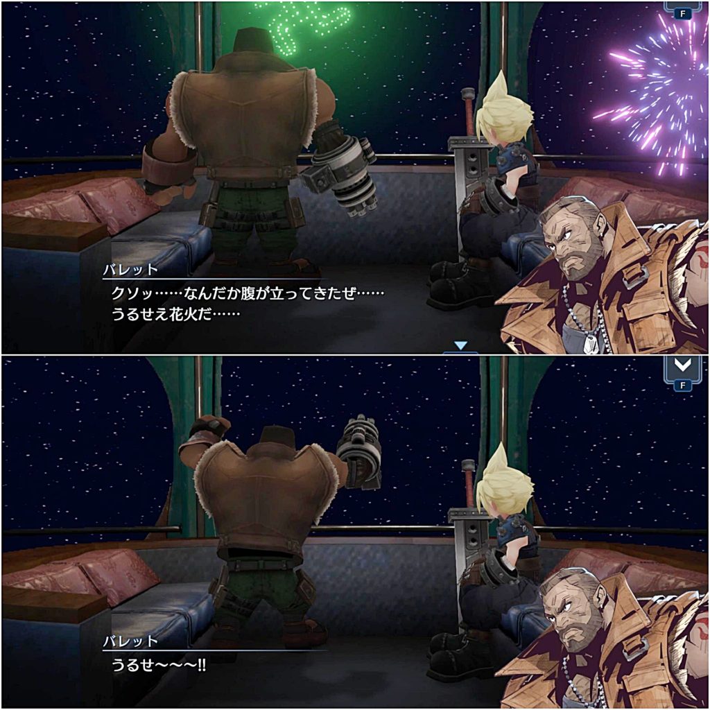 中から剣の音やバレットの銃声の音が聞こえ、最後満足そうに出てきたバレットとただ付き合っただけというふうなクラウドに吹いたw