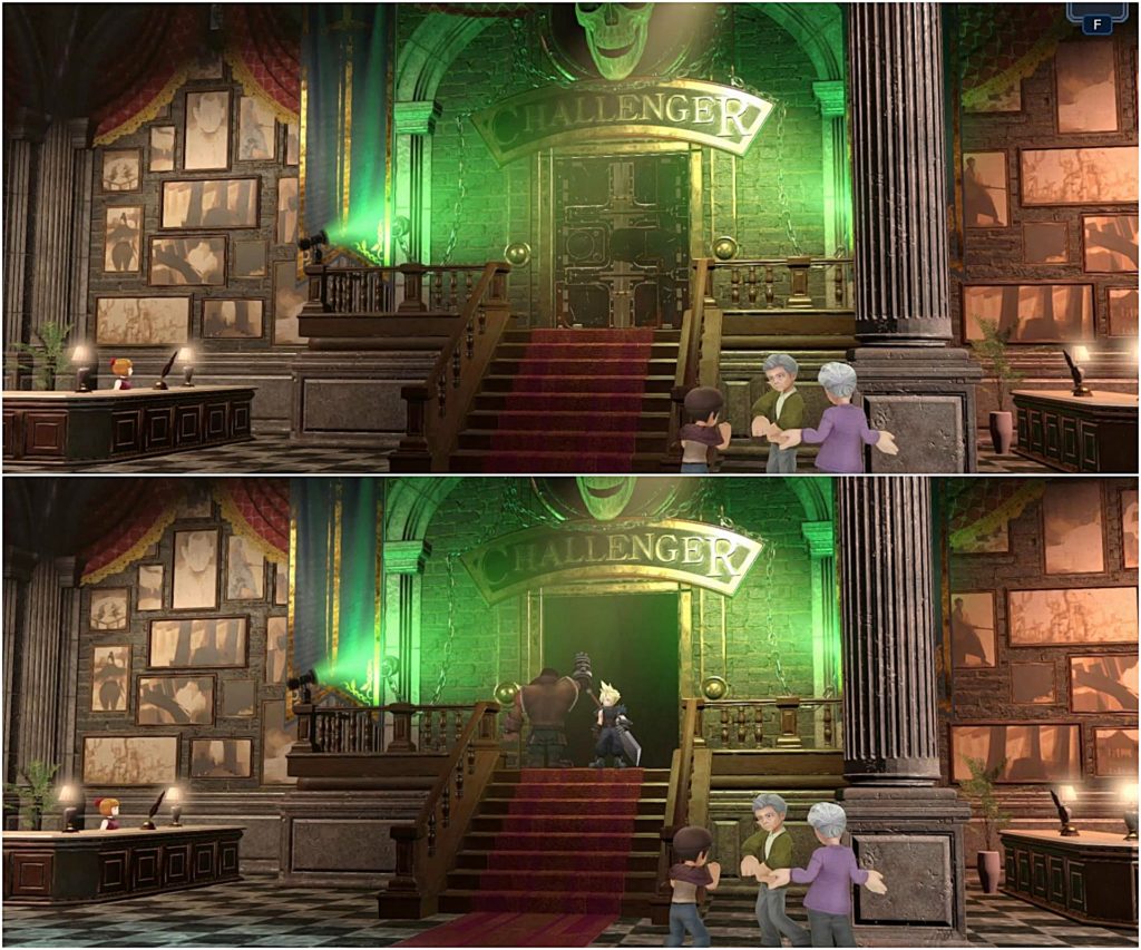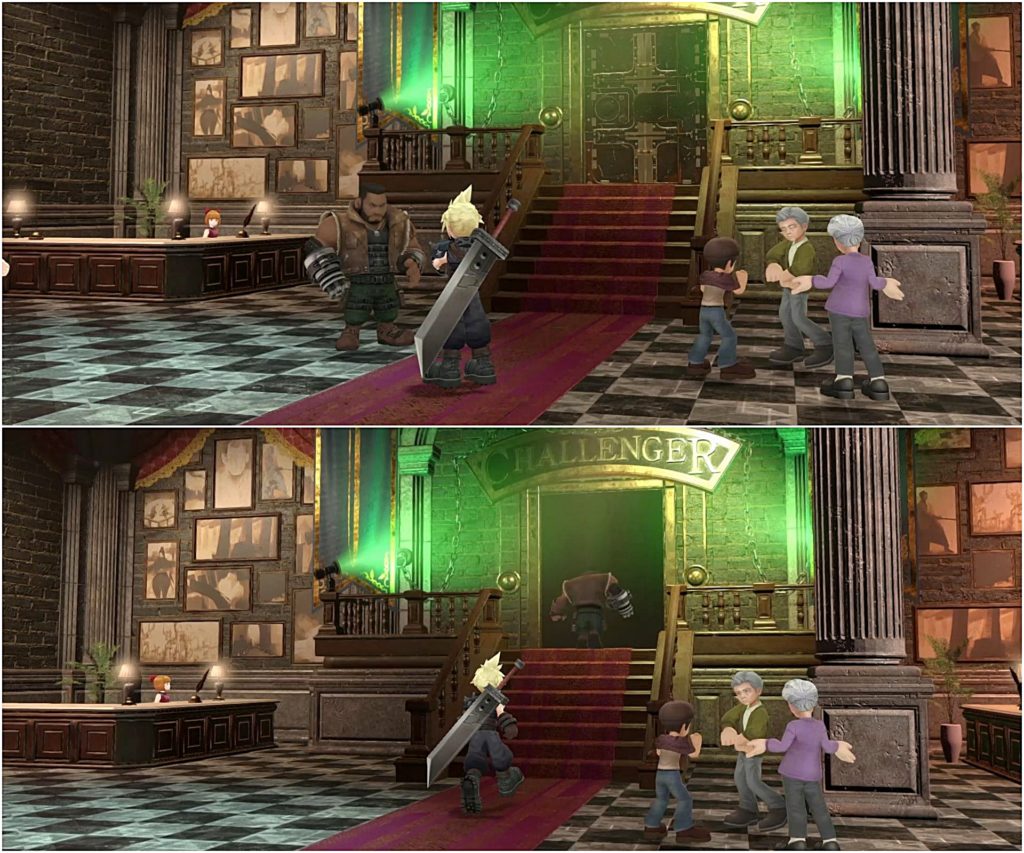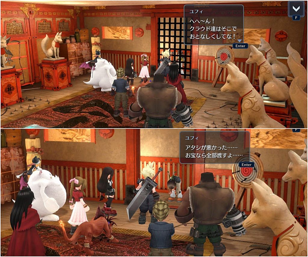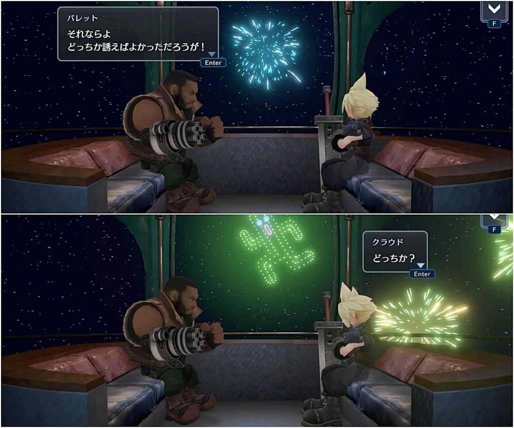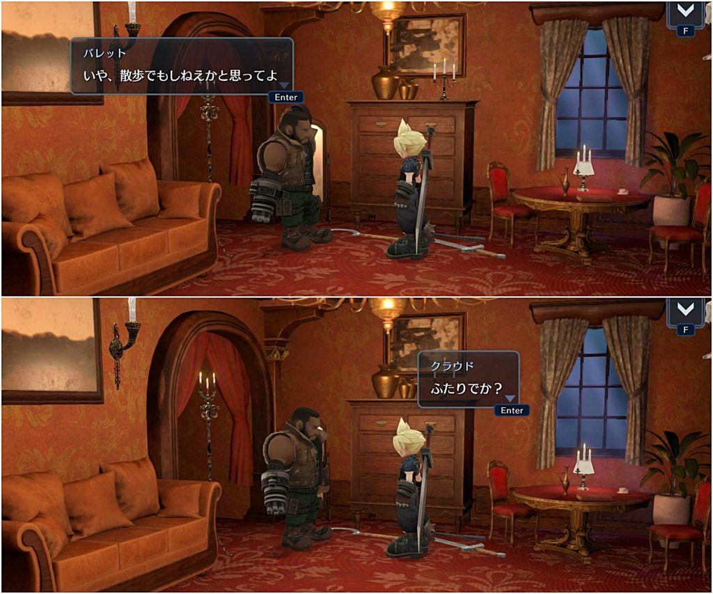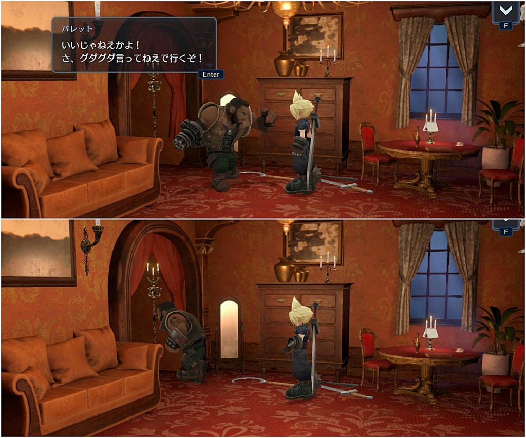 中から剣の音やバレットの銃声の音が聞こえ、最後満足そうに出てきたバレットとただ付き合っただけというふうなクラウドに吹いたw