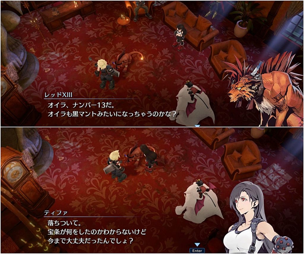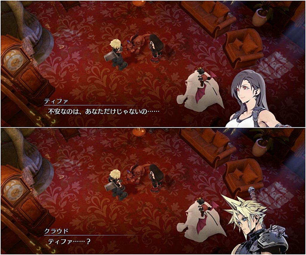 ここ、原作だとティファの言い方が少しキツい感じ(ウジウジしないで!って言い方)だったんだけど、ECでは言い方をやわらかに変えてきてるのはいい改変だなと思った。
