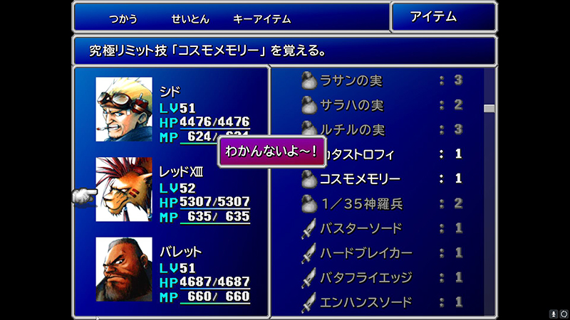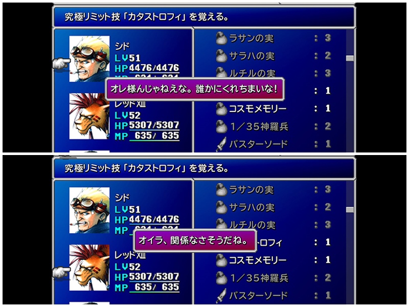 で、ここではバレットの最終リミット技を覚えられるんだけど、これを関係のない仲間に覚えさせようとするとこんなふうにセリフが出る。