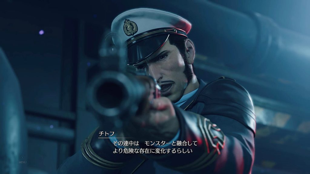船長が放つ銃からユフィを間一髪クラウドが守る。