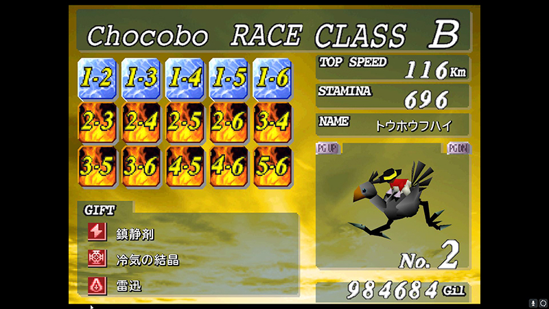 チョコボレースにおいて最大のライバル、ジョーが騎乗するトウホウフハイ。