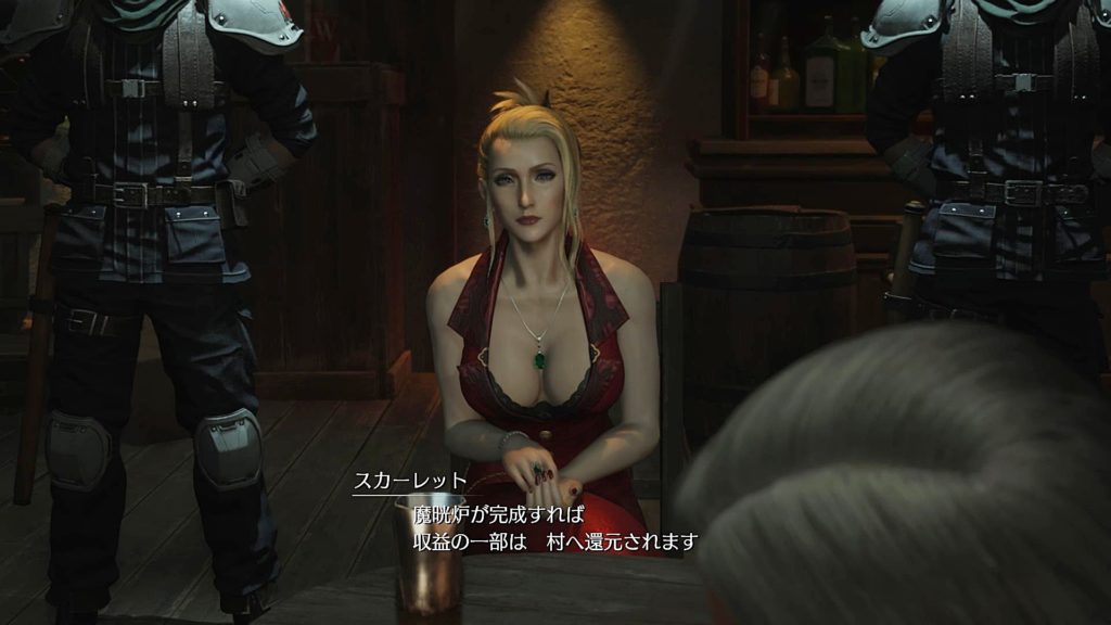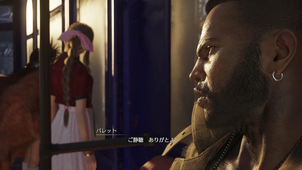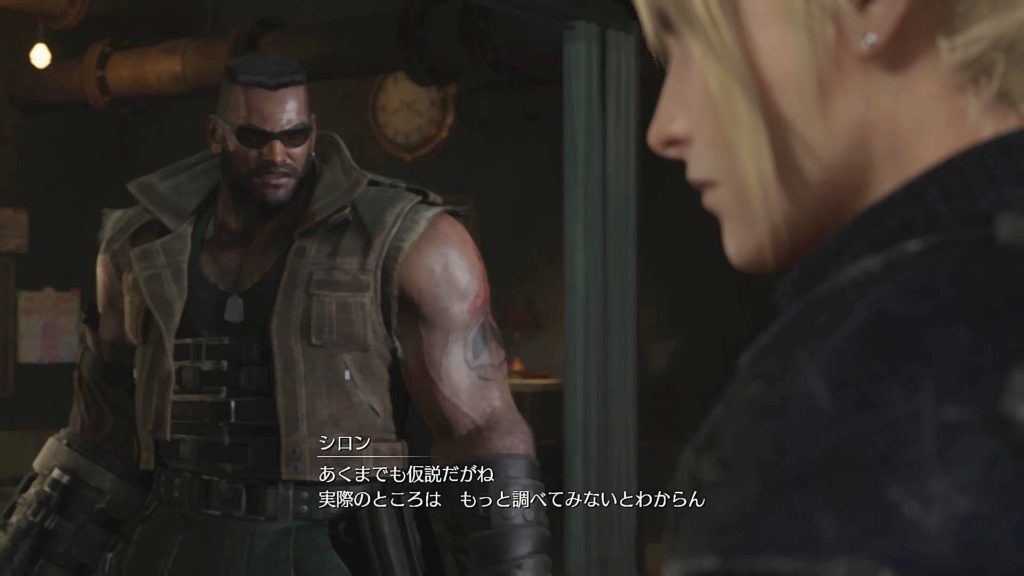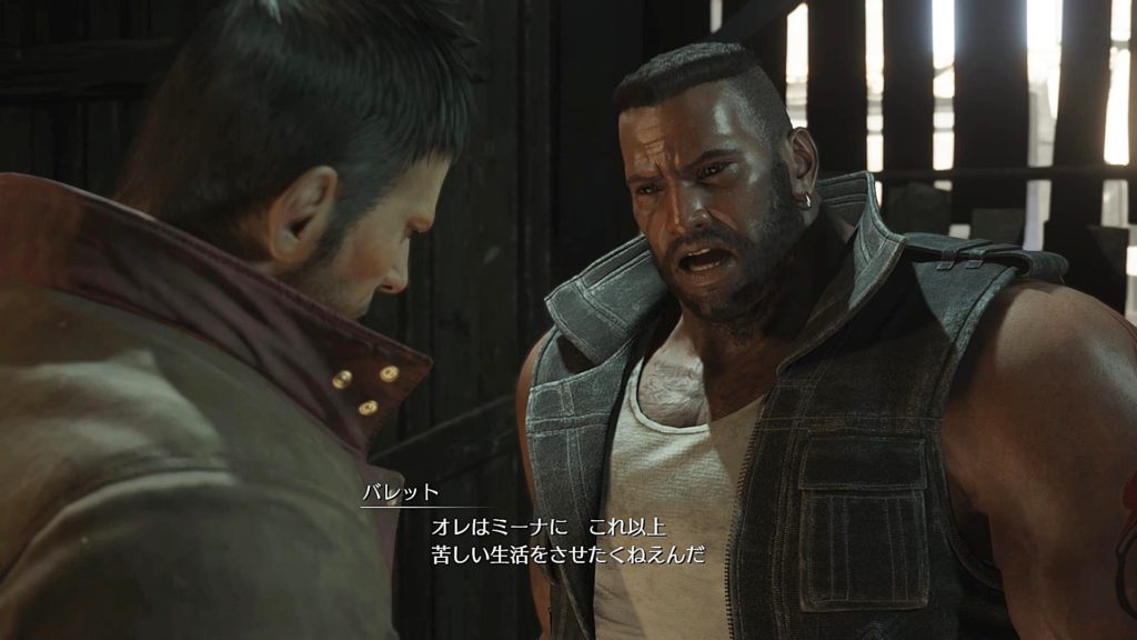 クラウドの様子が時々おかしいことをバレットも気にかけているというのは原作でも普通にプレイしていればわかるけど、リアルな等身になったことでより丁寧にわかりやすく表現されるのはリメイクのいいところだと思う。
