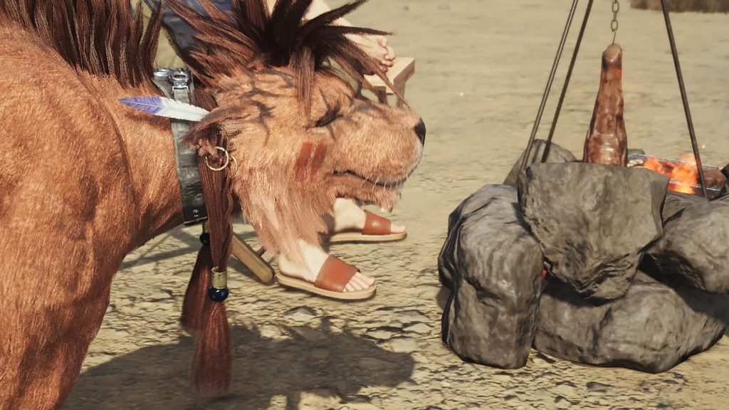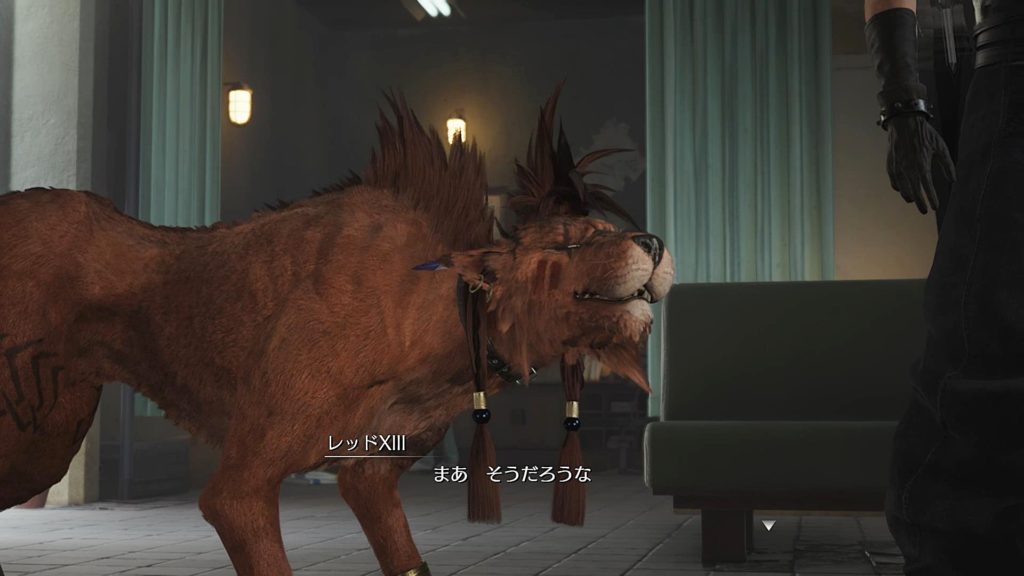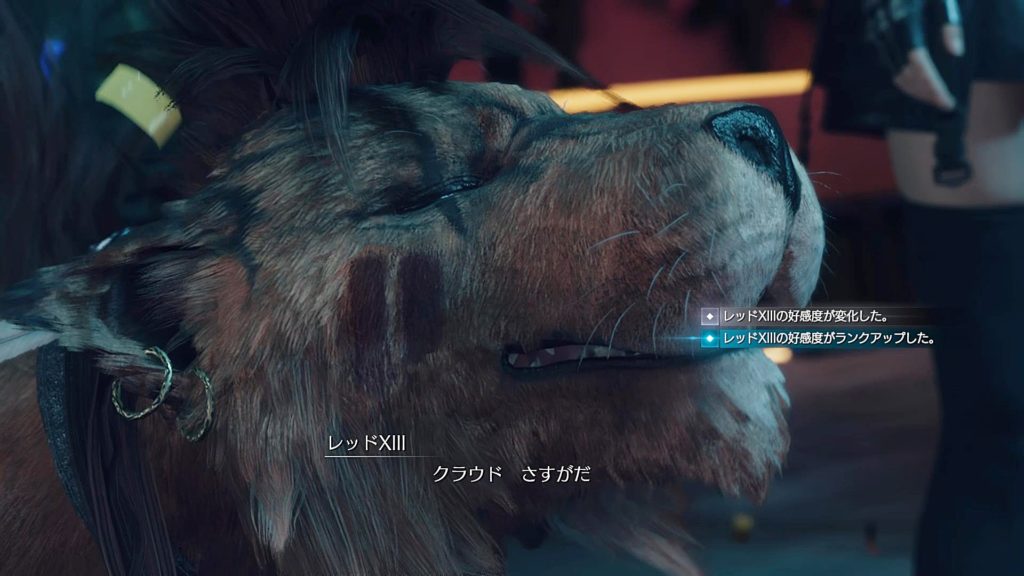 その後、正直に自慢の鼻の弱点は食欲に負けるということを白状するナナキがかわいいし、それに対してクラウドがふっと笑うのがまたかわいい。