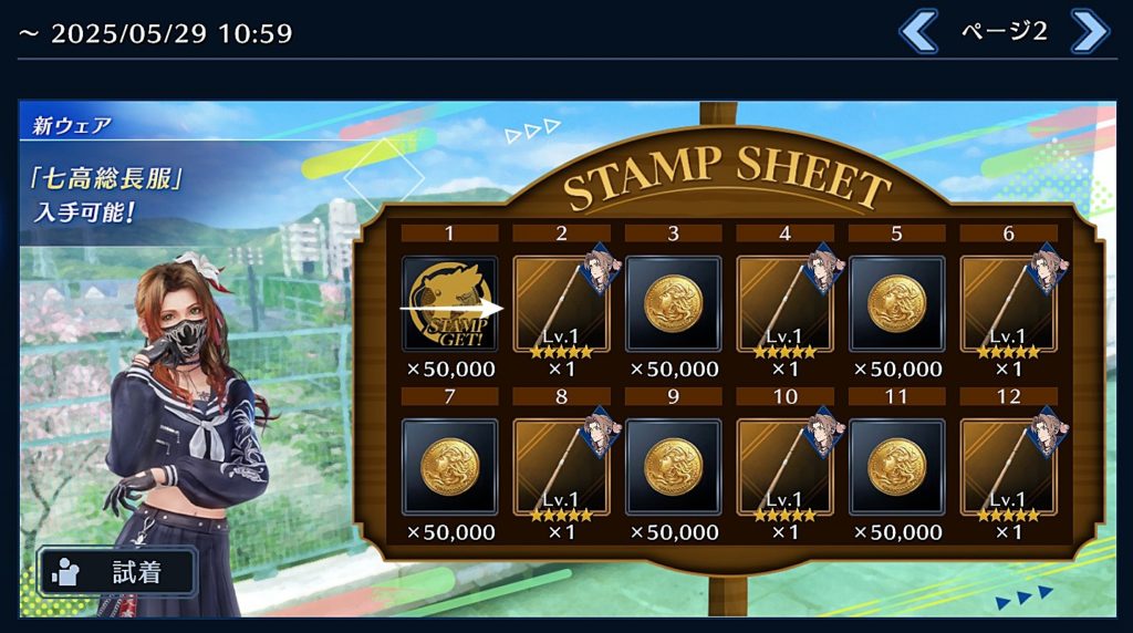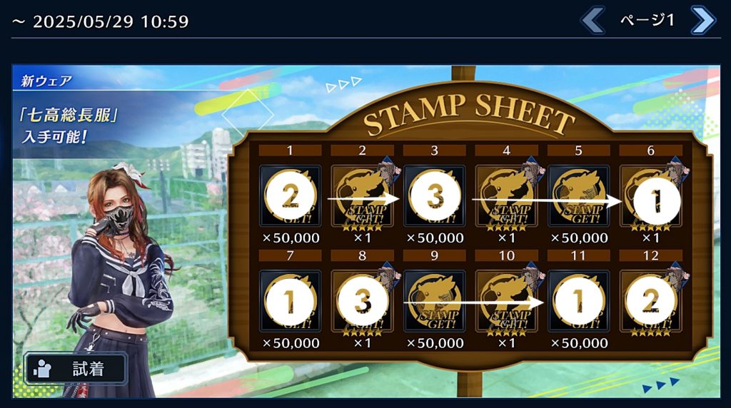 今回のエバクラ学園のガチャだけは通常のスタンプシートが違って、ふたマスおきごとに星5ガチャ武器が当たる(学割らしい^^;)お得仕様で簡単に完凸できるようになってます。